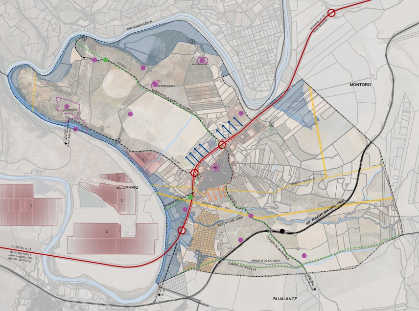 - Infraestructura verde, conectividad territorial y uso público del medio: refuerzo del papel de los sistemas fluviales —especialmente el tramo del río Guadalquivir— como corredores ecológicos estructurantes, impulso de su integración paisajística y uso público compatible, así como mejora y preservación de la red de caminos rurales y vías pecuarias como corredores verdes que favorezcan la conexión entre el medio urbano y rural y el desarrollo de actividades recreativas y turísticas sostenibles.
